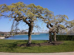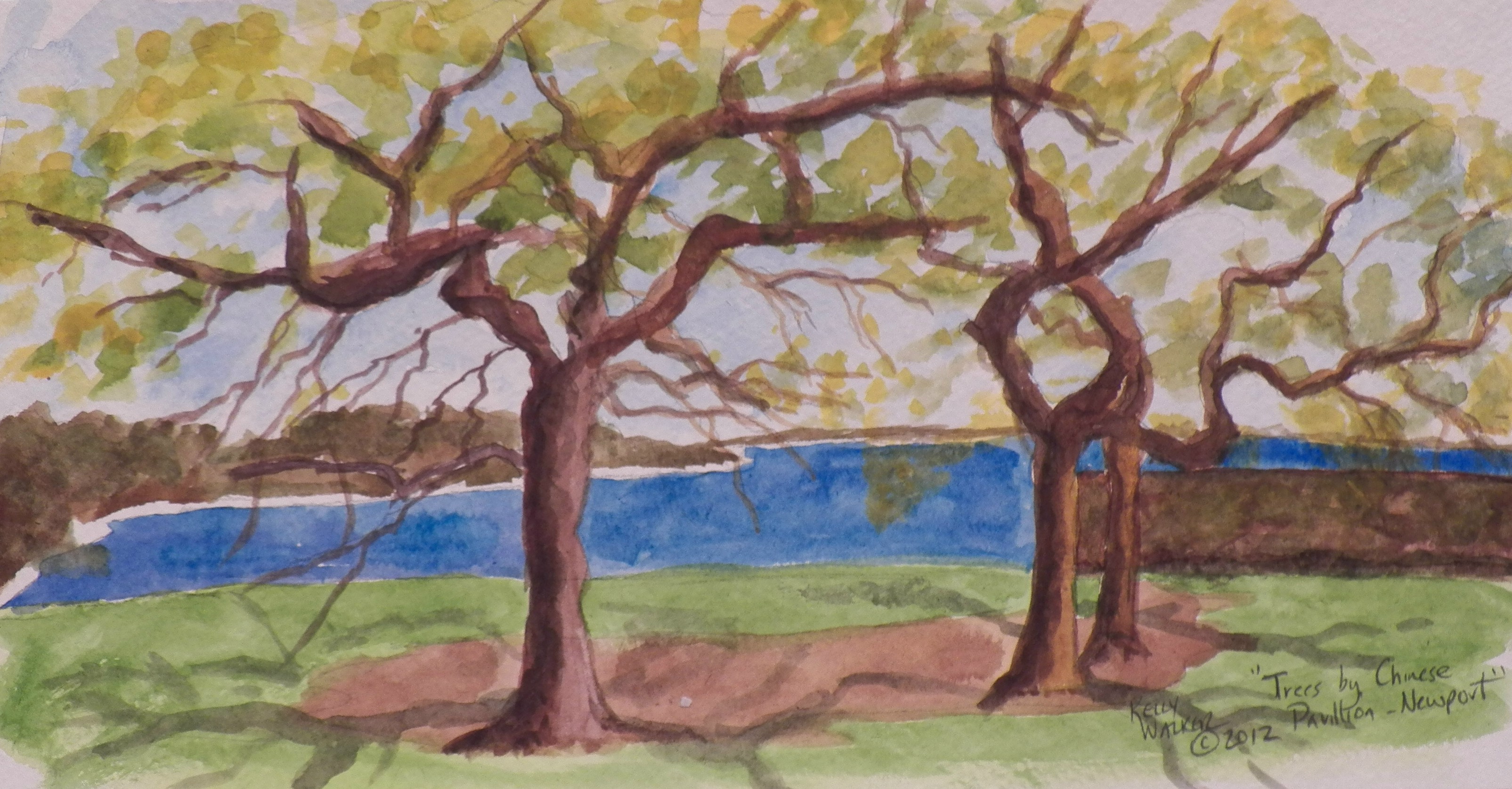 The least fun part of a great vacation is the trip home. Yesterday I had several hours to wait at the airport. Luckily I had packed my travel watercolor kit so while I waited at the cafe with my tea I worked on a little sketch of a photo I took in Newport of the “Trees by the Chinese Pavillion”.