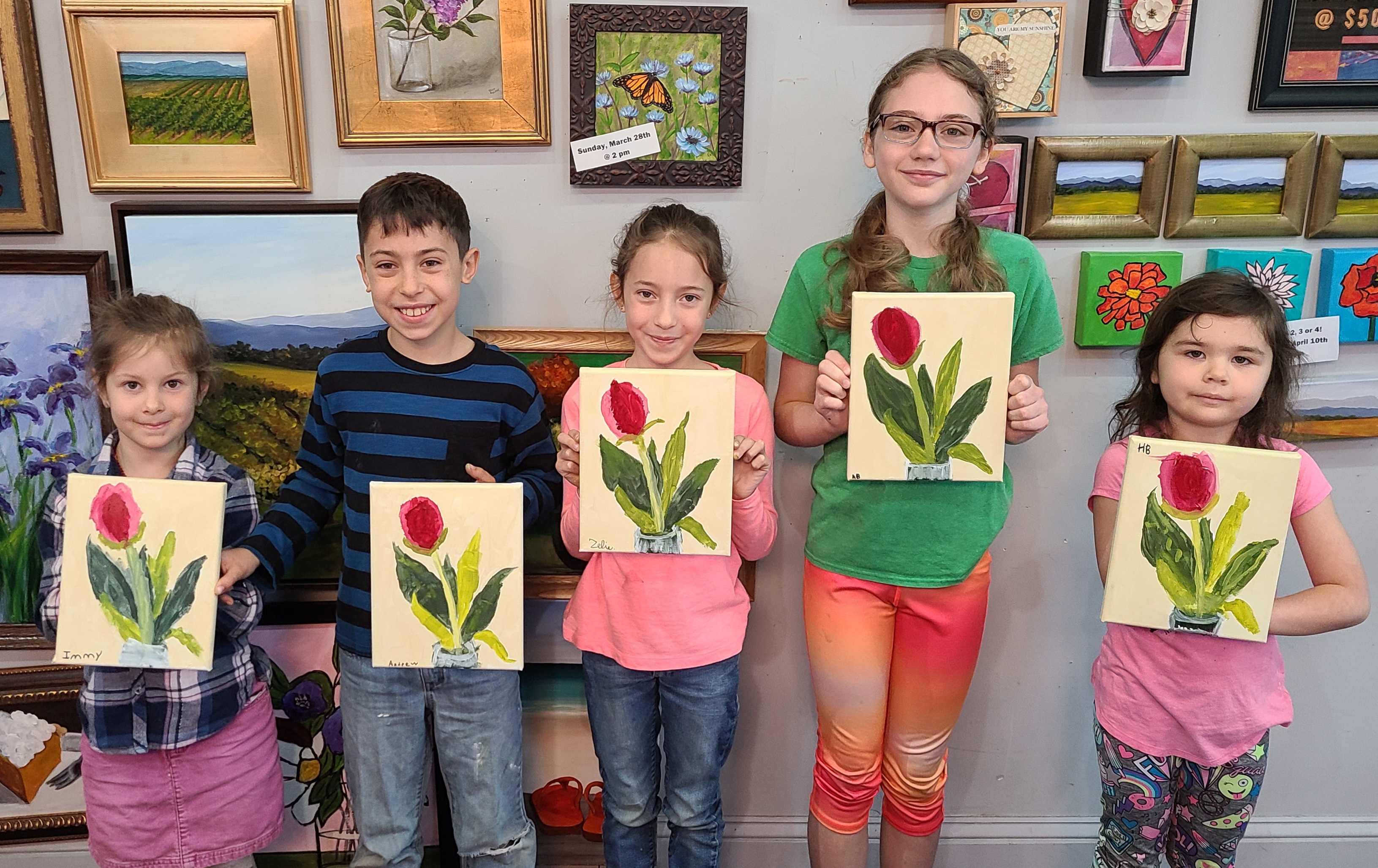 The kids painted these lovely tulips with acrylic on watercolor paper yesterday at class. Great work!