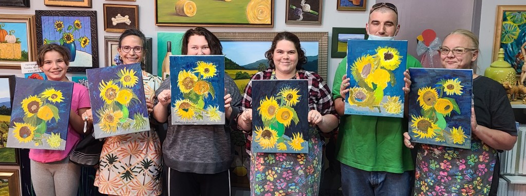 Yesterday we started holding our “Famous Painters” class again at The Studio and it was a big success as these painters and a few more created these gorgeous Sunflower paintings after Van Gogh’s Three Sunflowers. Aren’t they great???!!!! Nice work all around. Next month’s session will feature Monet and there are only 4 seats remaining so if you are interested be sure to register now. See that painting and registration information here. https://thestudio-104116.square.site/product/jul-28th-famous-painter-class-monet-s-dahlia-s-1883/702?cs=true&cst=custom