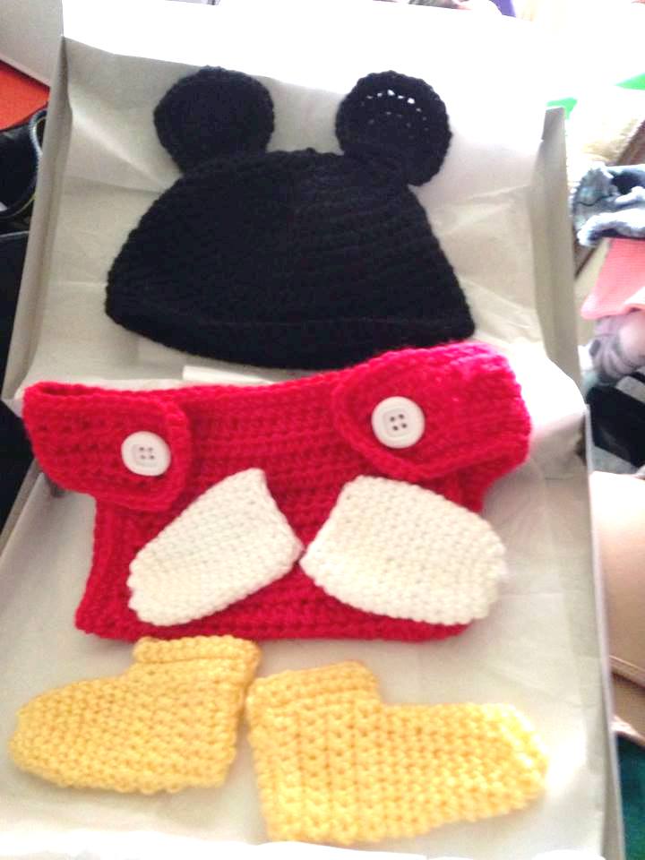 A month or so ago a friend asked me to crochet a Mickey Mouse outfit for her newborn grandson. Really? So, of course, I said I would give it a try. (Actually I said you crochet too. Why don’t you try it? LOL) And here it the result.
