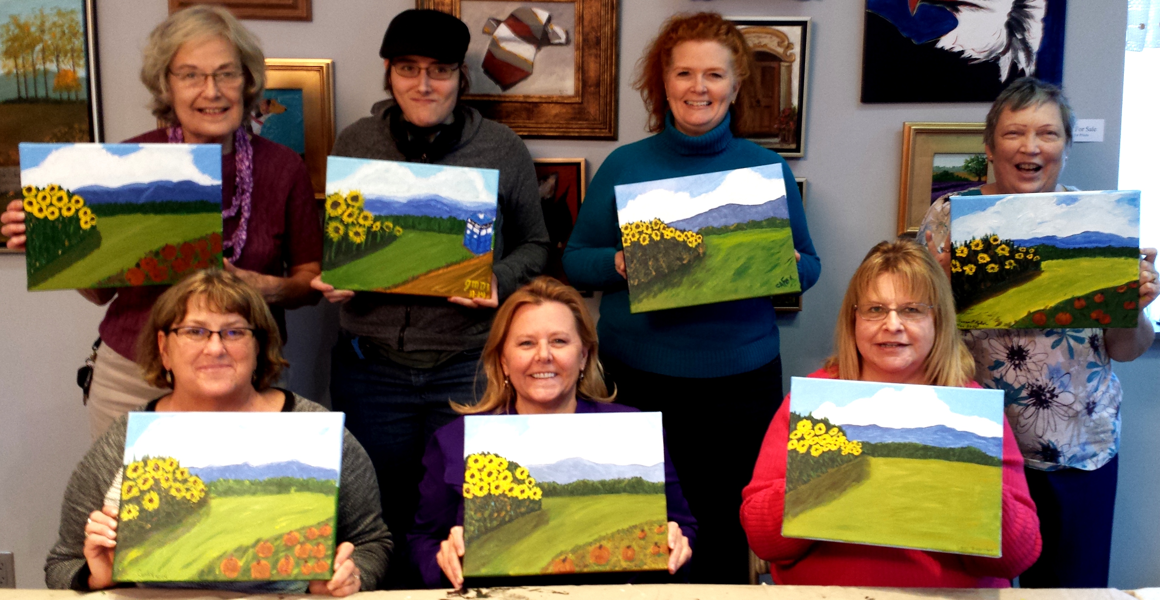 We painted beautiful Sunflower Scenes -and some with Pumpkins- at the 1st Saturday Paint Party yesterday at The Studio.