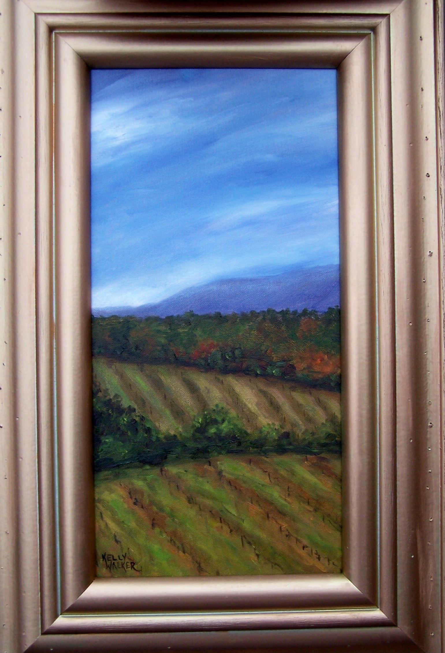 Vineyard View is an oil on 16″x8″ canvas panel and is shown here framed.  It is available by contacting me at kwalker@doubledogdesigns.com .