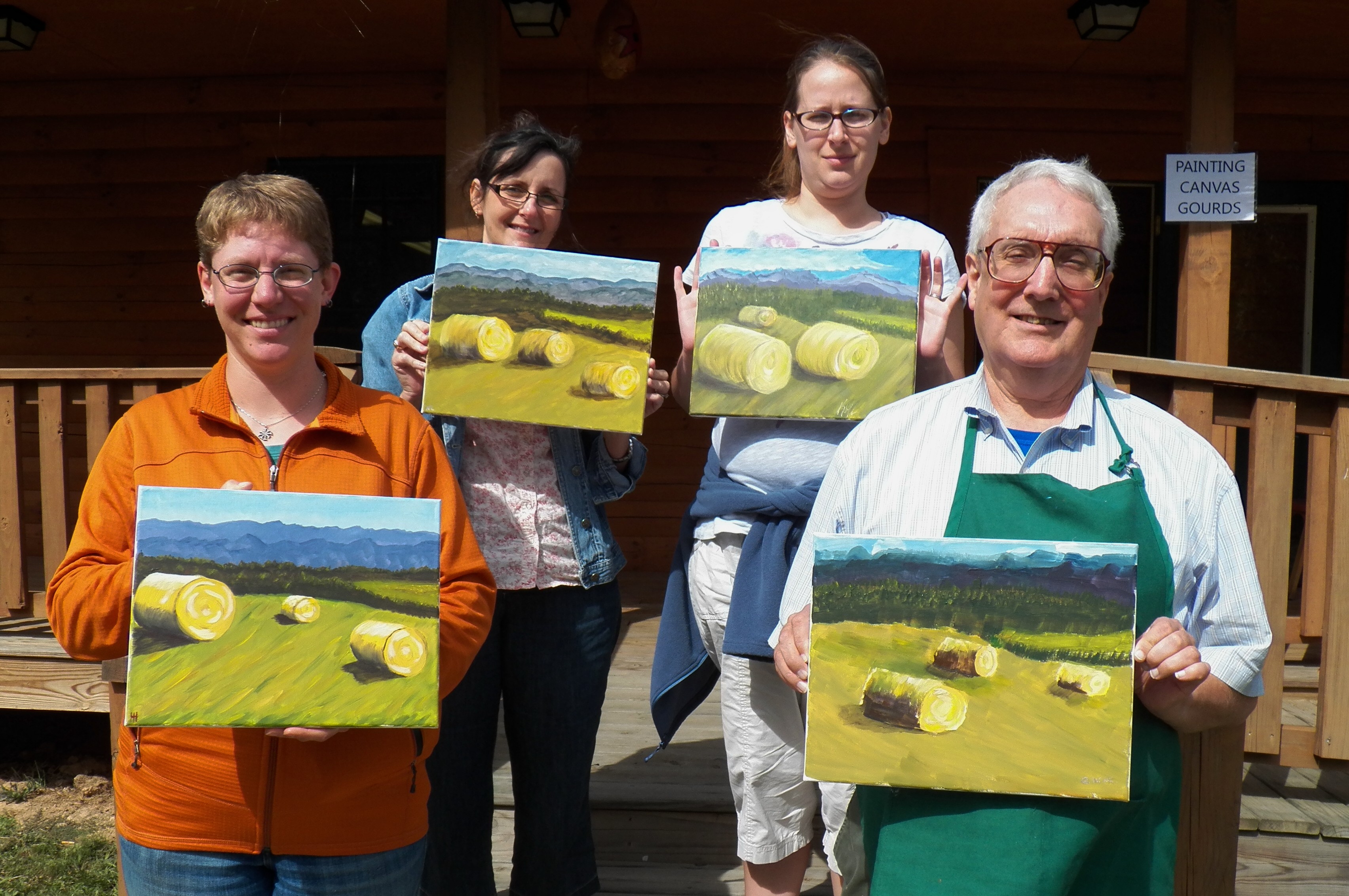 was held this weekend at Camp Shepherd in West Virginia. (Remember the painting of the chickens I did for a poster a few months back. See it here.) There were a multitude of workshops to choose from where attendees learned everything from painting to cheesemaking to container gardening to apron making and much, much more. There was a diverse group of life-long learners there taking it all in. And they were from all over the United States and even one from Canada! I taught six classes – three for Canvas Painting and three for Gourd Painting. Most of the students shown here had never painted. And didn’t they do a TERRIFIC job. It was so nice being with all the attendees and helping them develop new talents. Tomorrow we will look at the Gourd Painters!